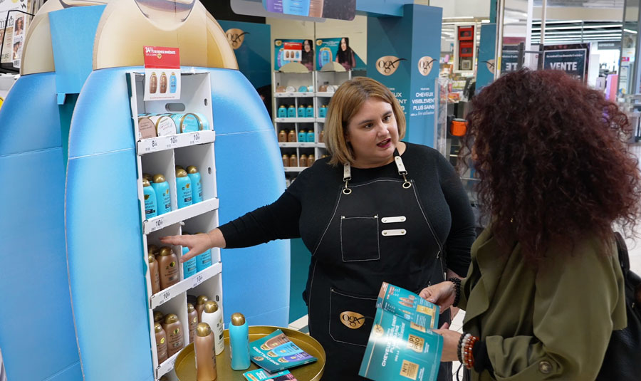 Au sein du shop-in-shop OGX®, les animatrices sont un levier clé de performance. Formées au discours de marque et aux routines produits, elles délivrent un diagnostic capillaire personnalisé, suivi d’une mise en beauté offerte, favorisant l’essai en conditions réelles.