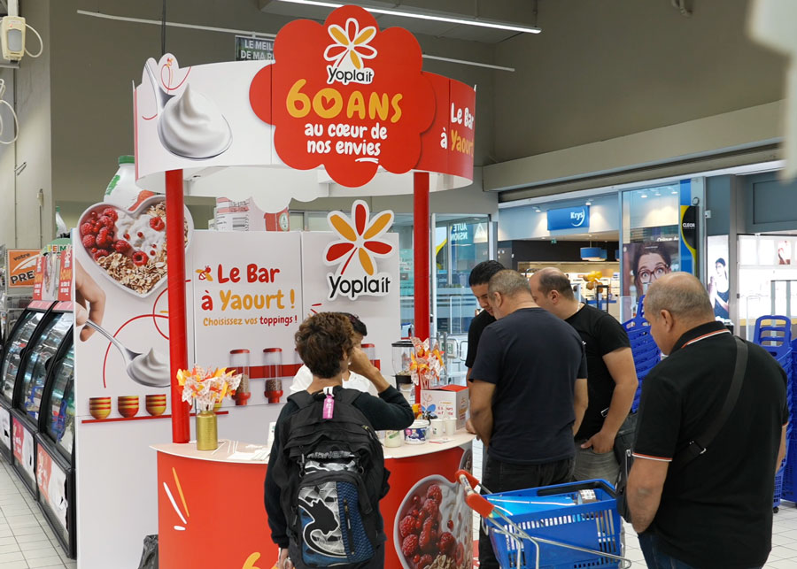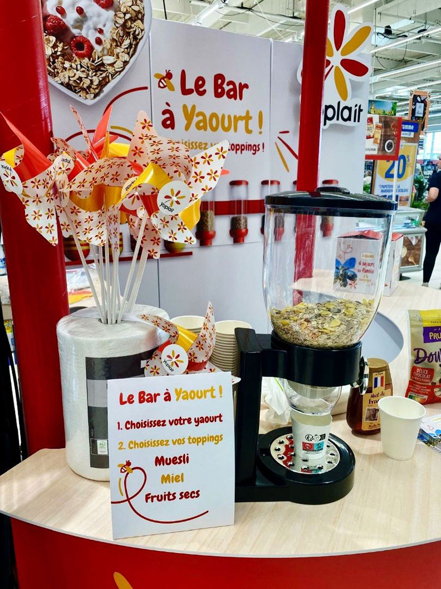 - PLV XXL « Bar à Yaourt » : une mise en scène immersive pour une visibilité maximale en hypermarchés,