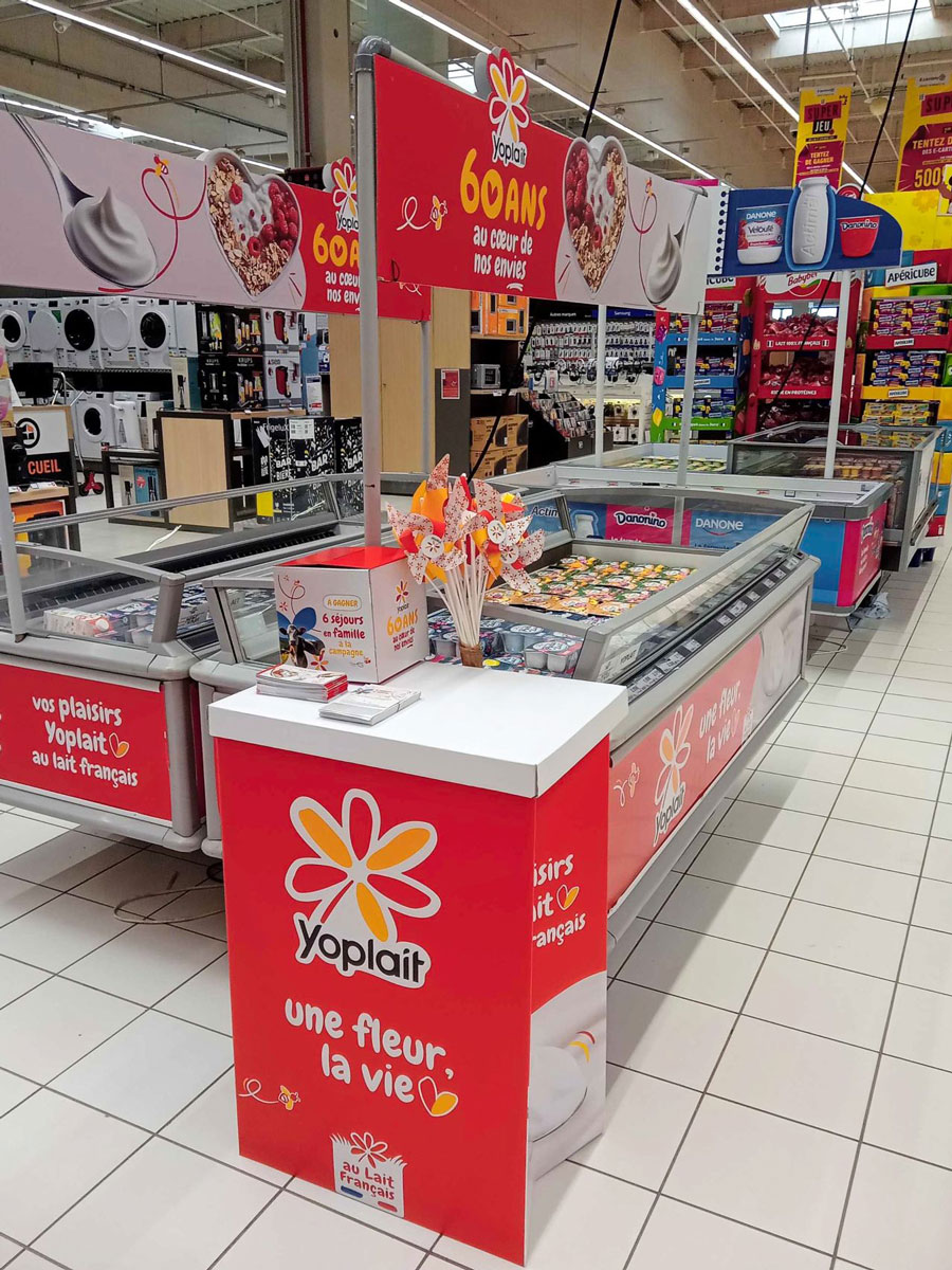 Mettre en lumière la richesse des gammes Yoplait tout en offrant une expérience immersive et sensorielle en magasin, à l'occasion des 60 ans de la marque.Notre solution